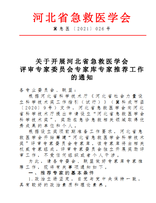关于河北省急救医学会评审专家委员会专家库专家推荐的通知