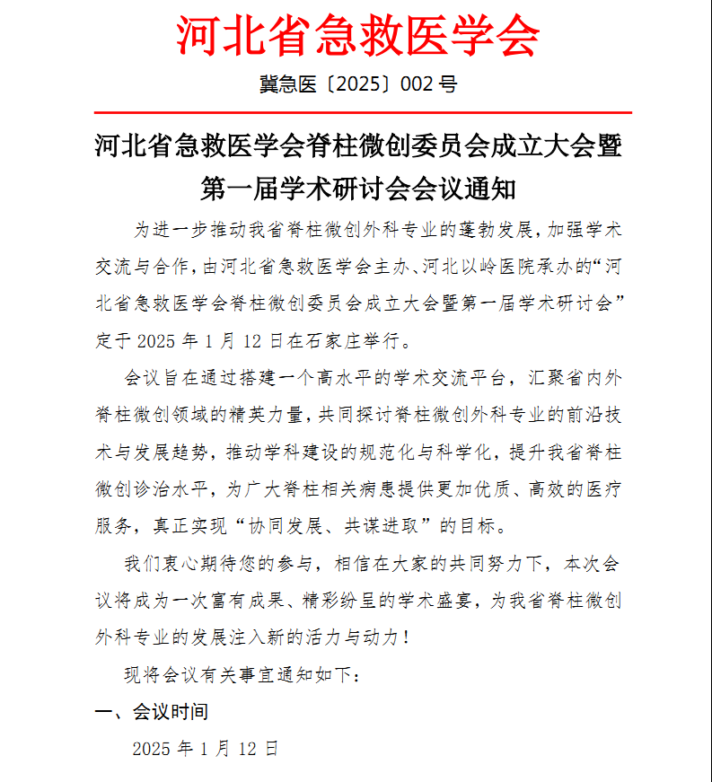 河北省急救医学会脊柱微创委员会成立大会暨 第一届学术研讨会会议通知