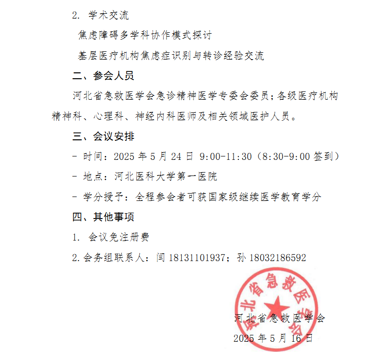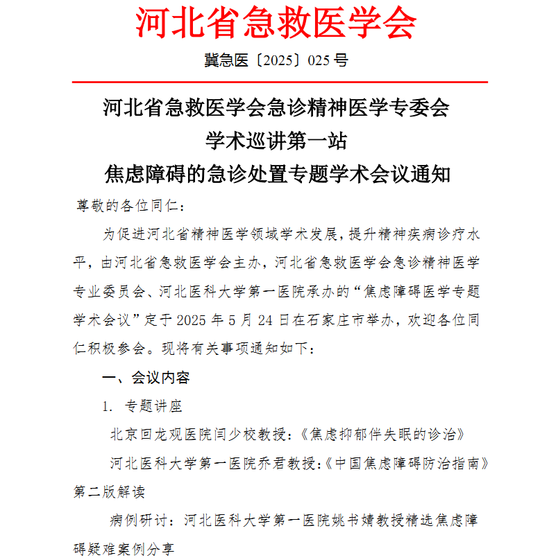 河北省急救医学会急诊精神医学专委会 学术巡讲第一站 焦虑障碍的急诊处置专题学术会议通知