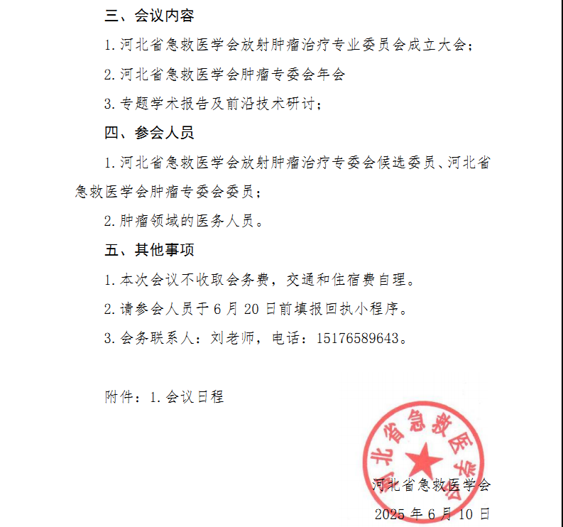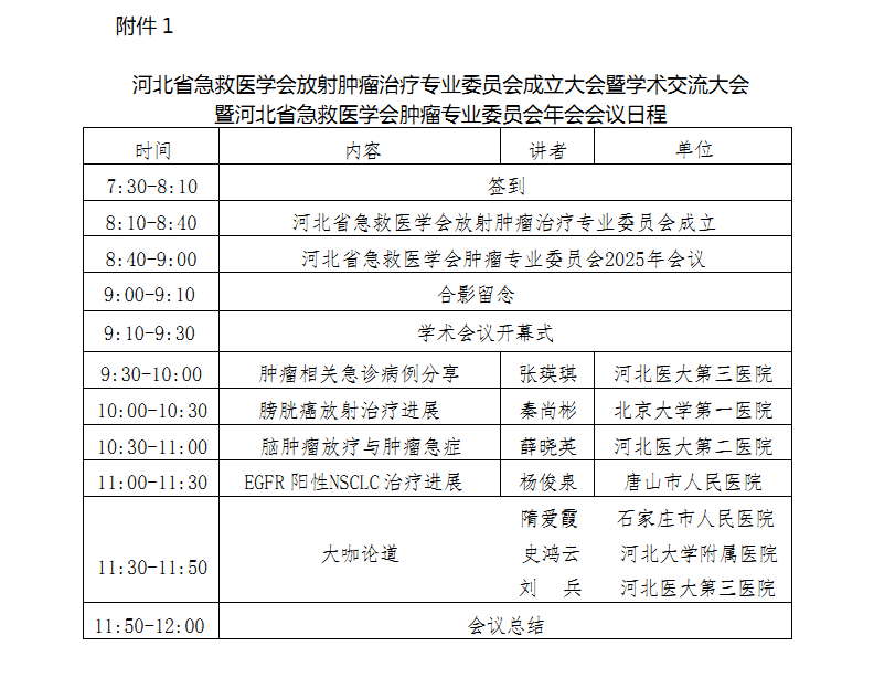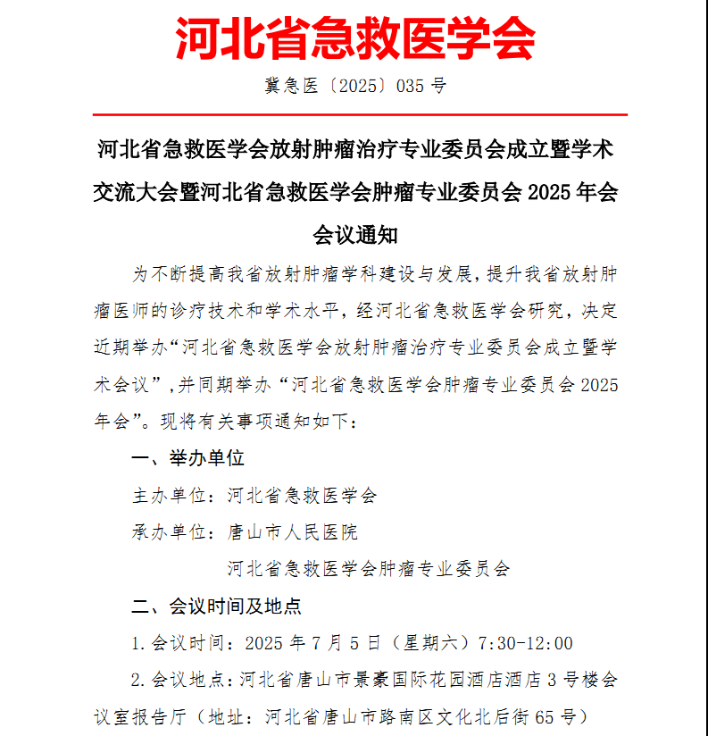 河北省急救医学会放射肿瘤治疗专业委员会成立暨学术 交流大会暨河北省急救医学会肿瘤专业委员会 2025年会 会议通知