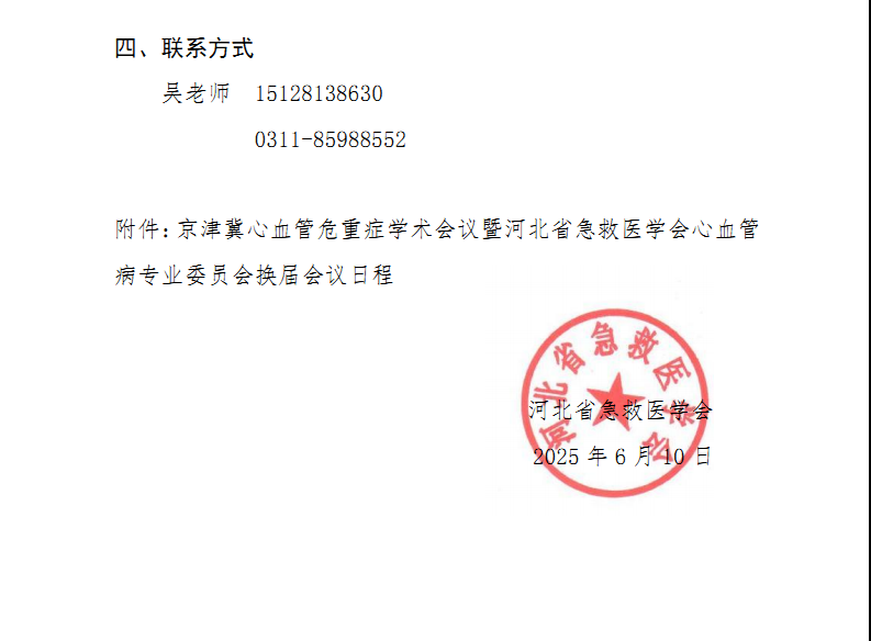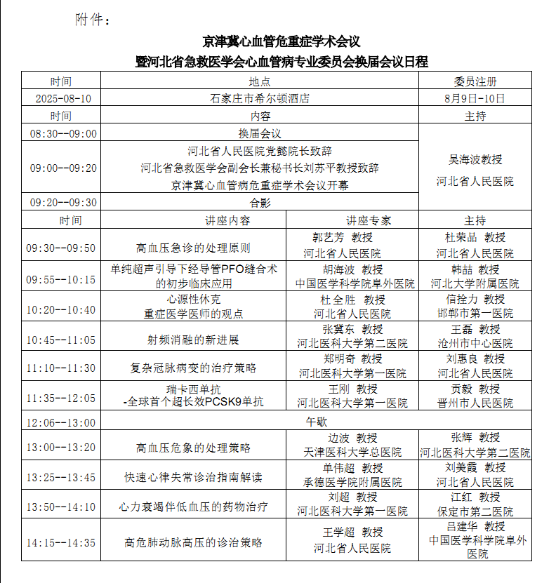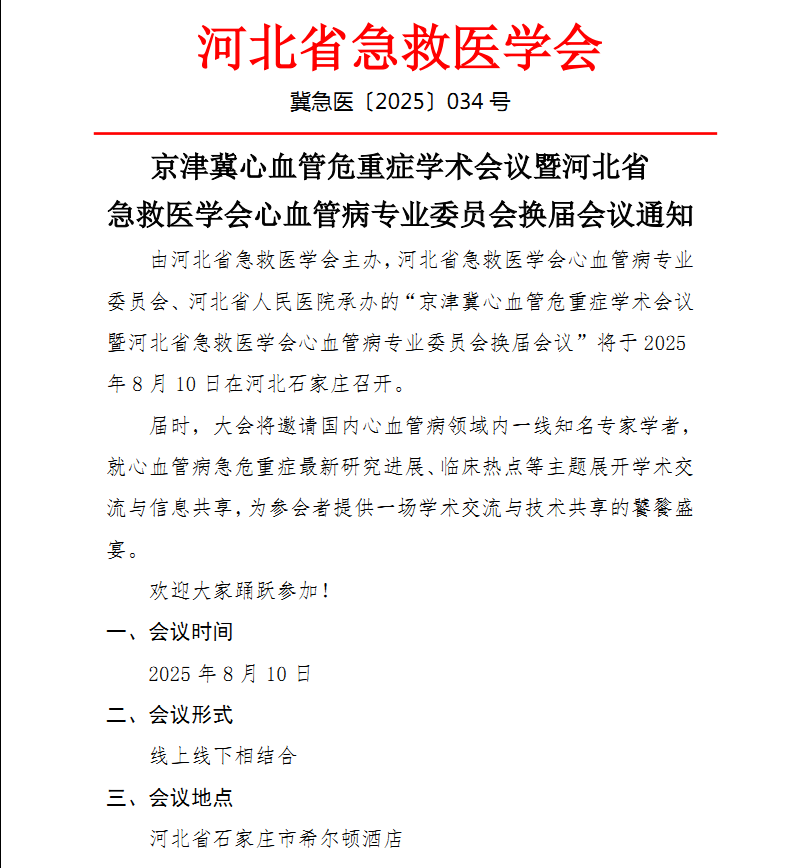 京津冀心血管危重症学术会议暨河北省 急救医学会心血管病专业委员会换届会议通知