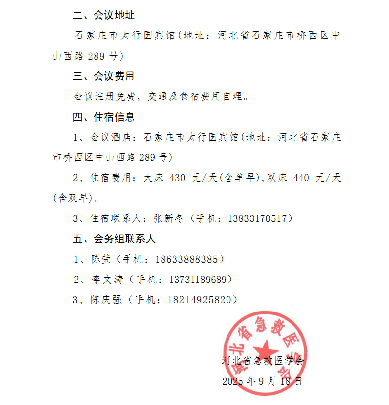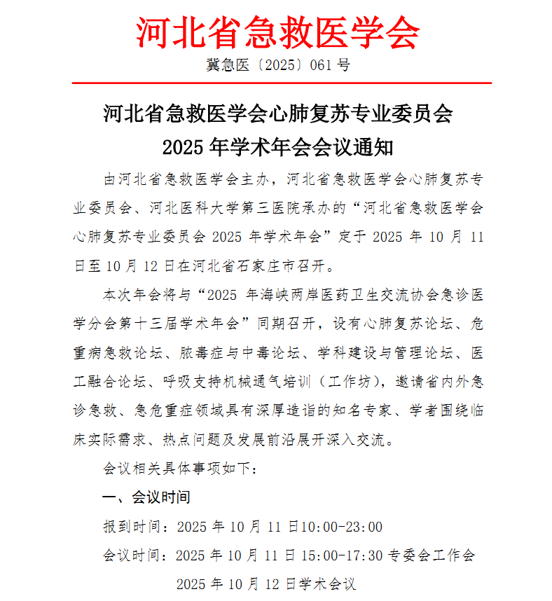 河北省急救医学会心肺复苏专业委员会 2025 年学术年会会议通知